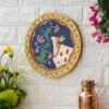 This hand-painted pichwai features a beautiful image of a cow surrounded by colorful flowers. The cow is a sacred animal in Hinduism, and this pichwai would be a perfect addition to any home or puja room.